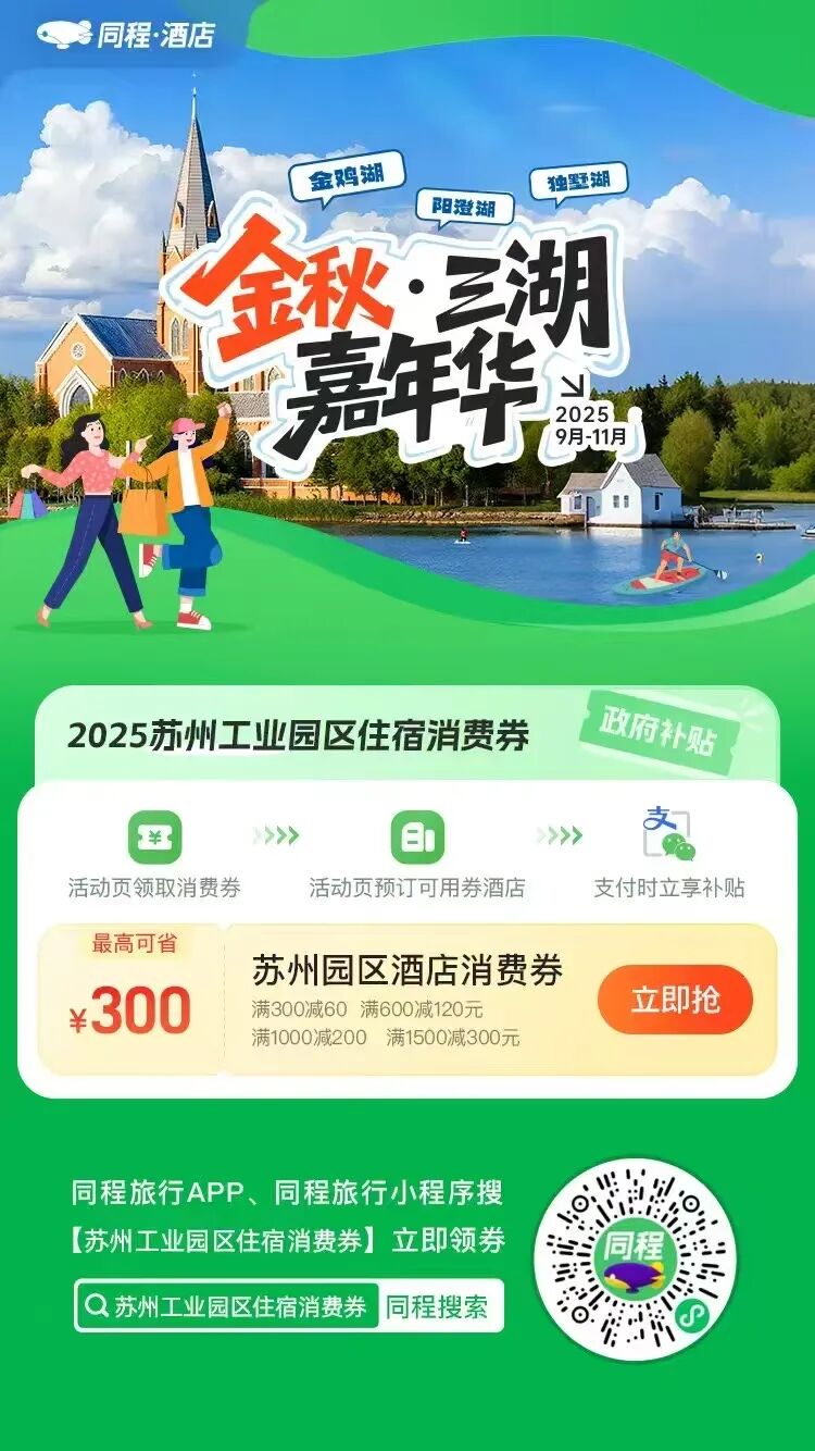 在住宿文旅領(lǐng)域,園區(qū)聯(lián)合同程旅行平臺(tái)發(fā)放百萬級(jí)住宿消費(fèi)紅包,市民游客登錄同程旅行APP或小程序,搜索“金秋?三湖嘉年華”進(jìn)入專題頁面即可一鍵領(lǐng)取住宿文旅消費(fèi)券,在活動(dòng)頁預(yù)訂可用券酒店,支付時(shí)立享補(bǔ)貼,最高可減300元。