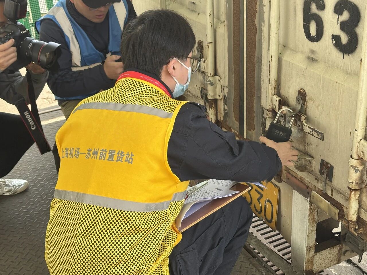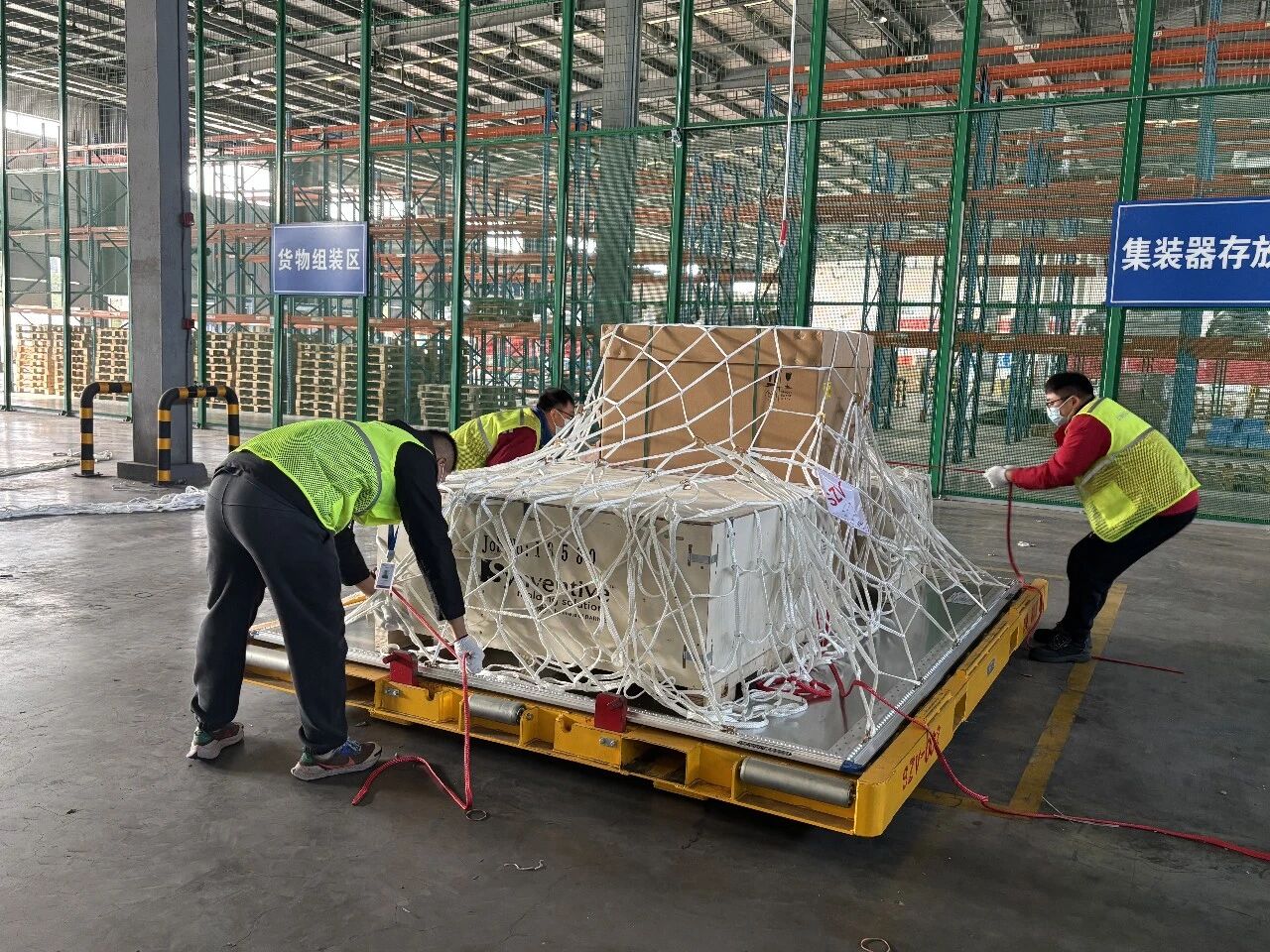 與以往不同的是,車上裝載的是蘇州前置貨站首票經(jīng)過海關(guān)全流程自動(dòng)化監(jiān)管放行的貨物,它們即將搭乘當(dāng)晚阿特拉斯航空8277次和埃塞俄比亞航空3749次航班,分別飛往美國(guó)和奧地利。